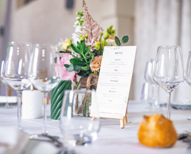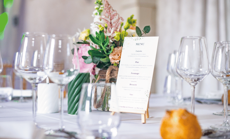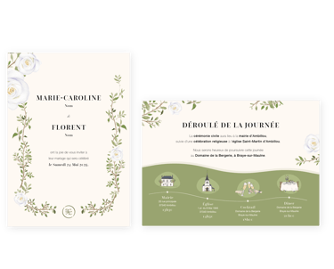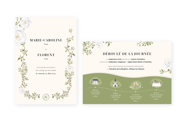 Mise en page et illustration de faire part, menu et étiquette pour les cadeaux des invités.